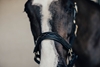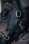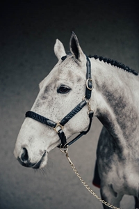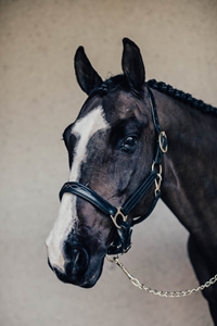 Grimma i finaste läder med extra vaddering i nacken och över nosen. Grimman har en fin detalj med vit söm på nosremmen. Lädergrimman har mässingspännen som passar fint till alla färger.