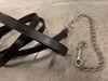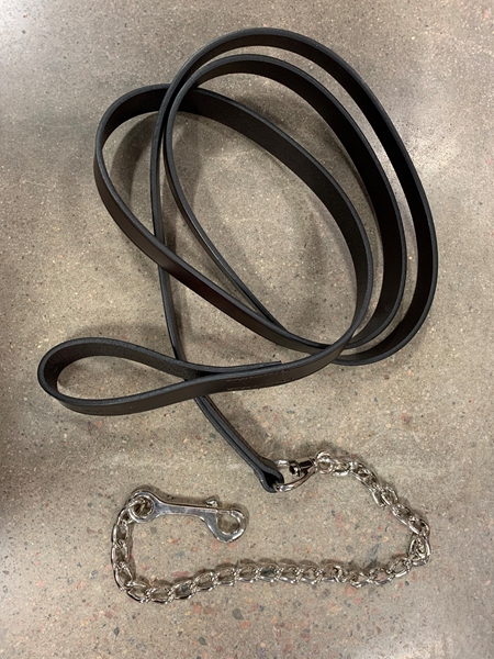 Grimskaft med silverkedja och slitstarkt skinn . Grimskaftet har en ögla i änden som ökar greppvänligheten och säkerheten. Kedjans längd är ca 80 cm och lädrets längd är ca 205 cm.