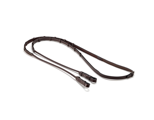 Rundsydda lädertyglar från Equipe. Tyglarna har gummi på insidan och stoppar – för bästa grepp!