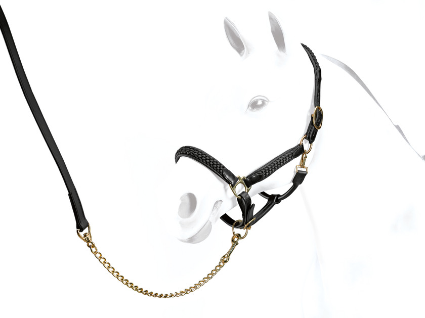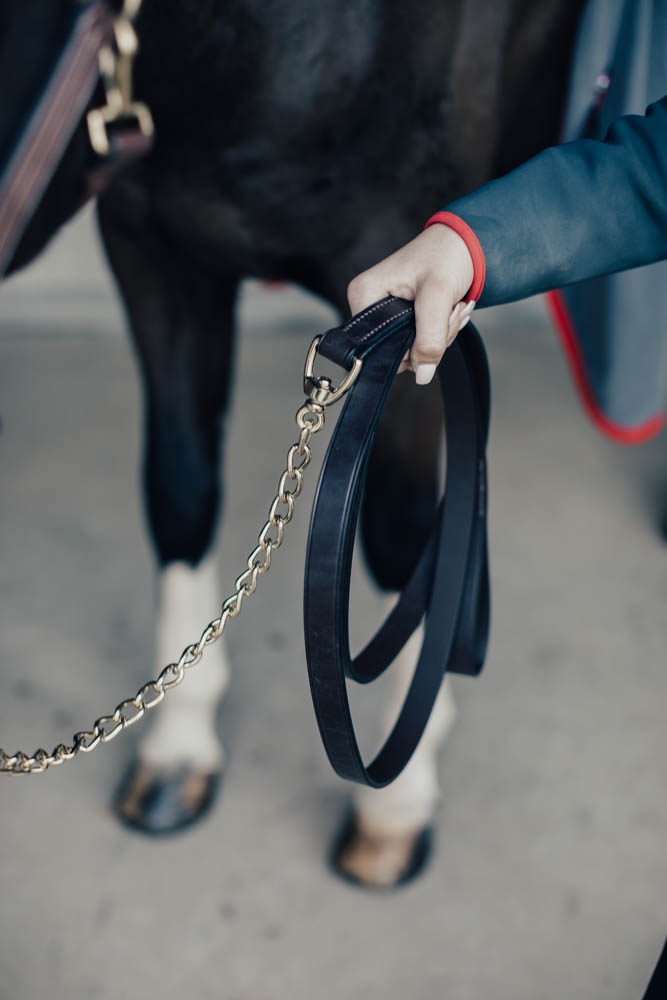 Grimskaft med mässingskedja och slitstarkt skinn . Grimskaftet har en ögla i änden som ökar greppvänligheten och säkerheten. Kedjans längd är ca 80 cm och lädrets längd är ca 205 cm.