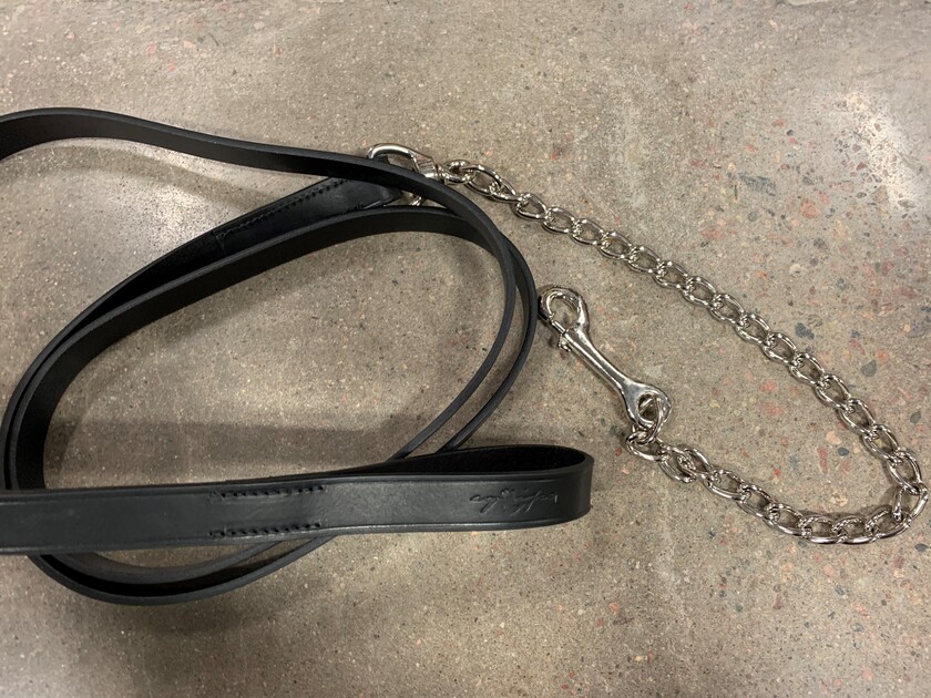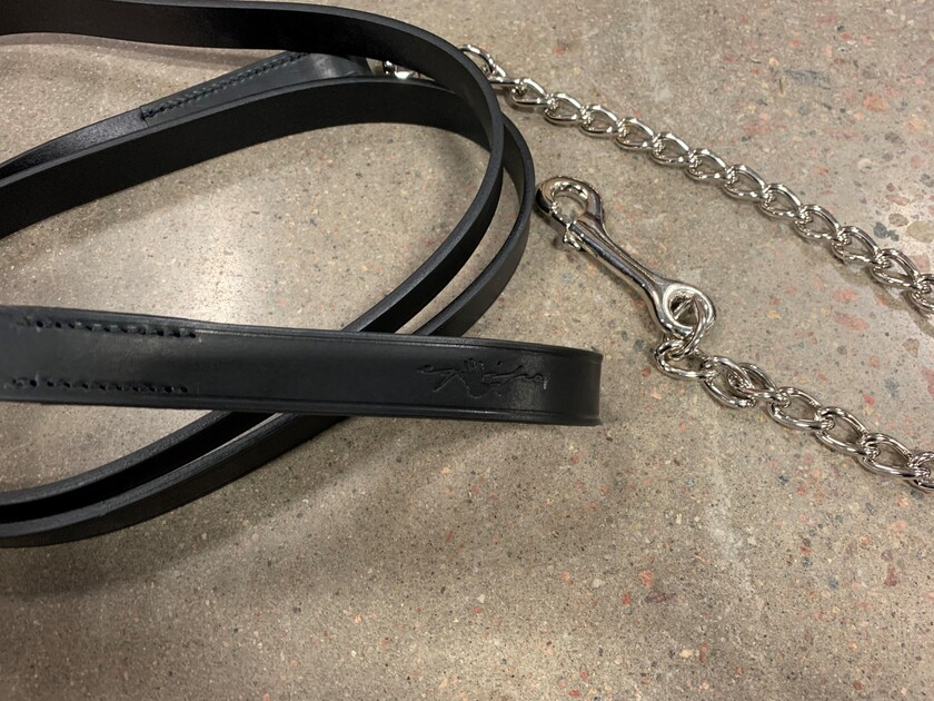 Grimskaft med silverkedja och slitstarkt skinn . Grimskaftet har en ögla i änden som ökar greppvänligheten och säkerheten. Kedjans längd är ca 80 cm och lädrets längd är ca 205 cm.
