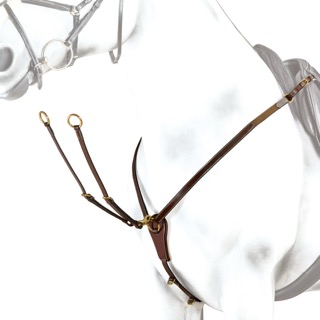 Förbygel i läder med höga fästen från Equipe Emporio. Avtagbar martingal som kan fästas i tre olika lägen. Denna förbygel har snabbhakar och mässingspännen.