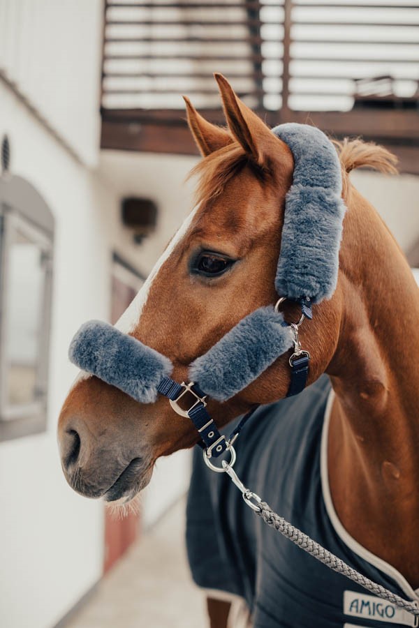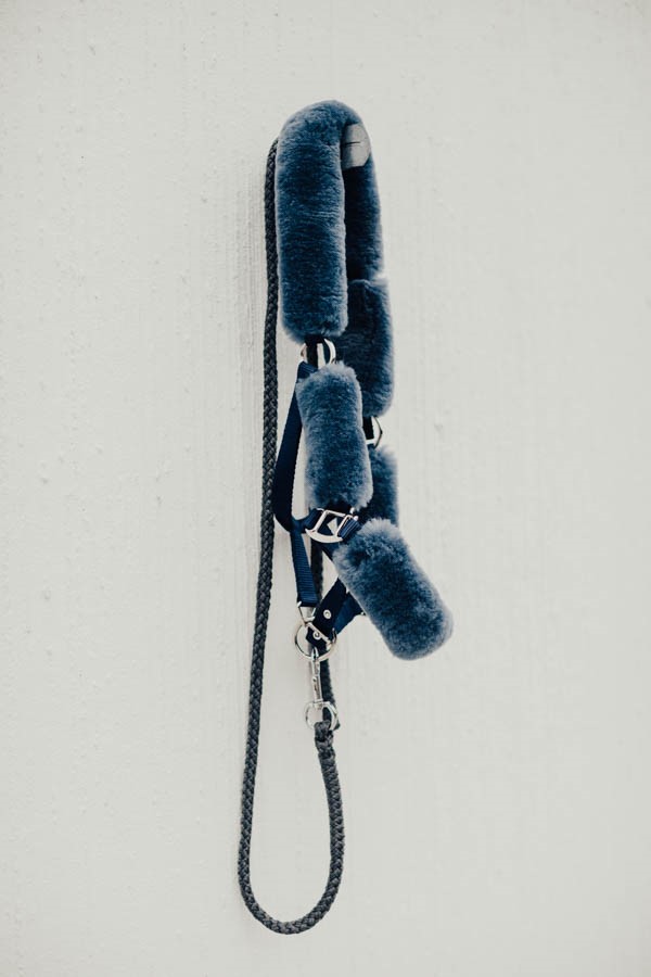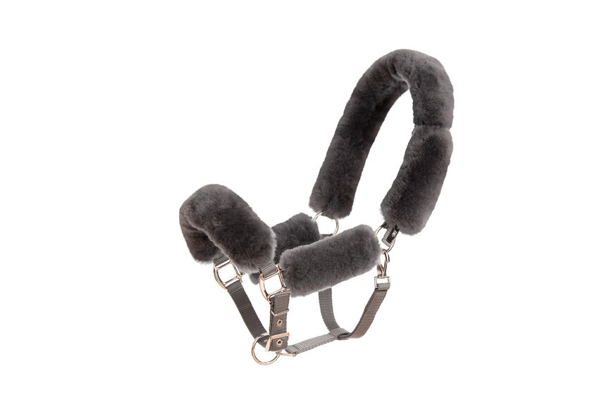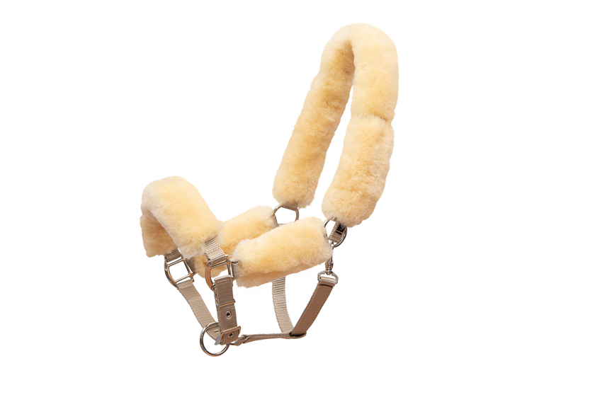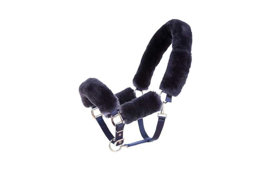 Grimma med fårskinnsludd med tillhörande grimskaft från EA Mattes. Supersnygg och mjuk och skön för hästen.