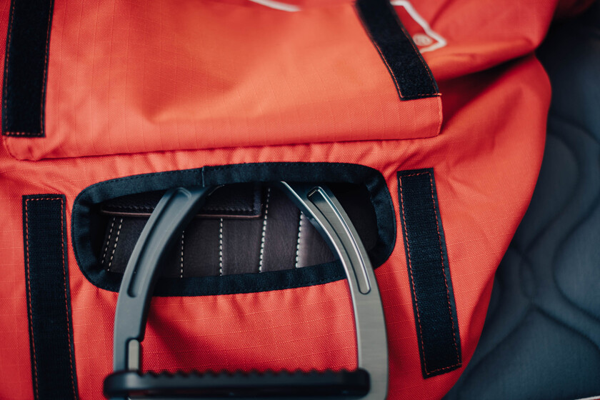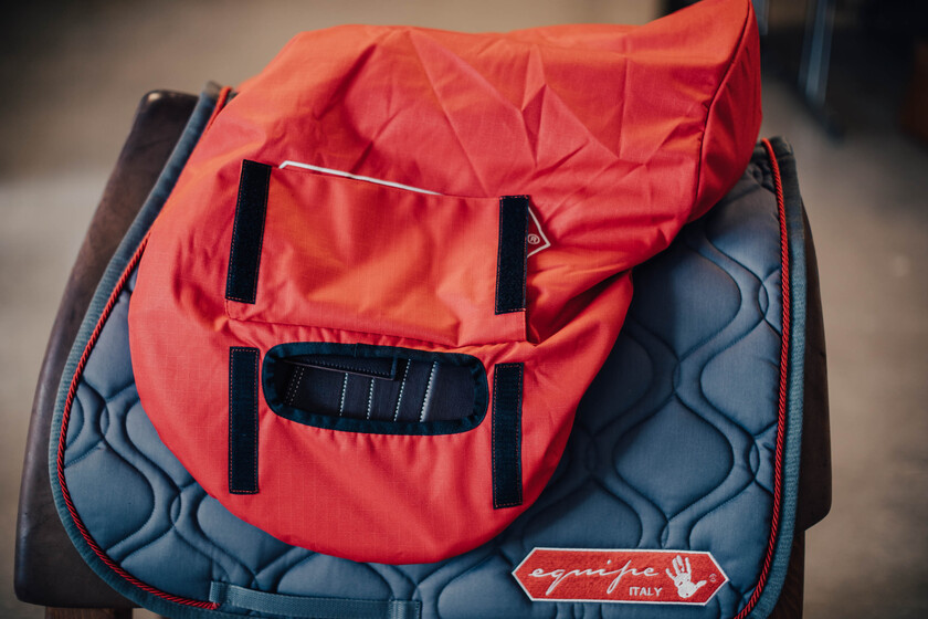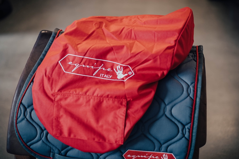 Sadelskydd till hoppsadel med insida av fleece, resår runt om och fickor för stigbyglarna.