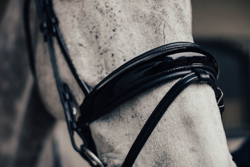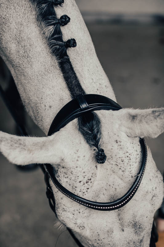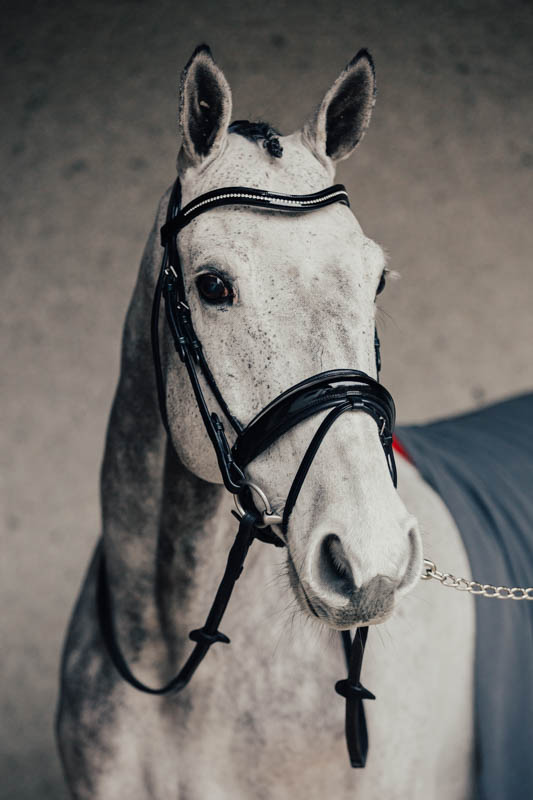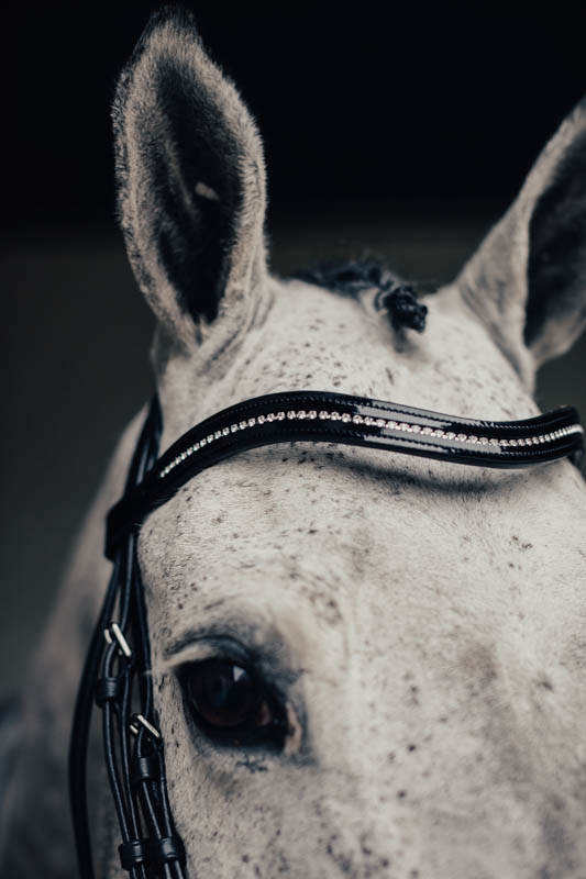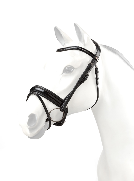 Dressyrträns i finaste kalvskinn från Equipe. Tränset är försett med ergonomiskt nackstycke med extra vaddering. Bred, lackad nosgrimma med pullabackknäppning och extra vaddering. Droppformat pannband i strass. Tränset är tillverkat av vegetabiliskt garvat läder från Europa.