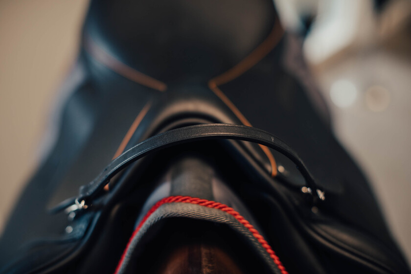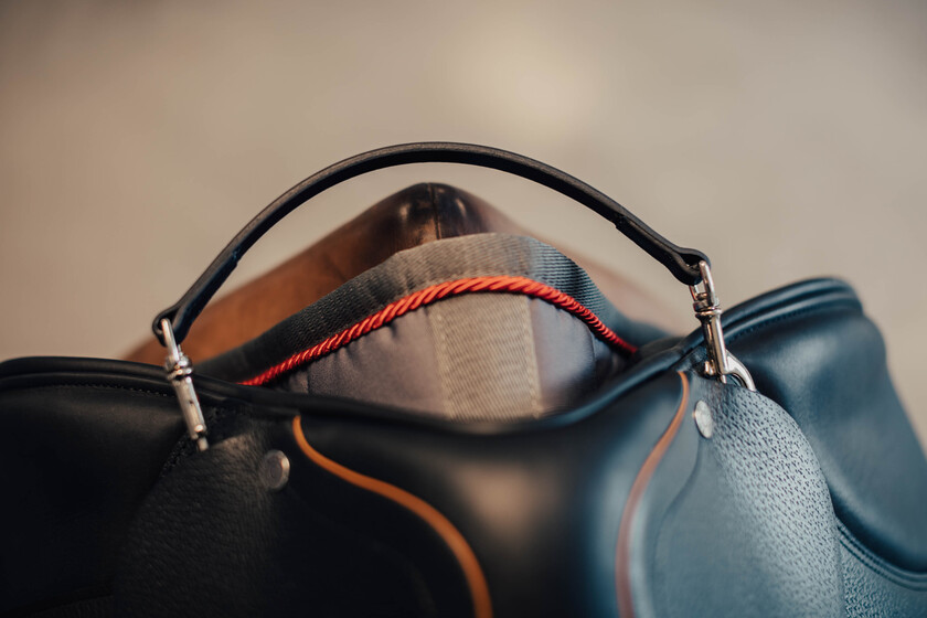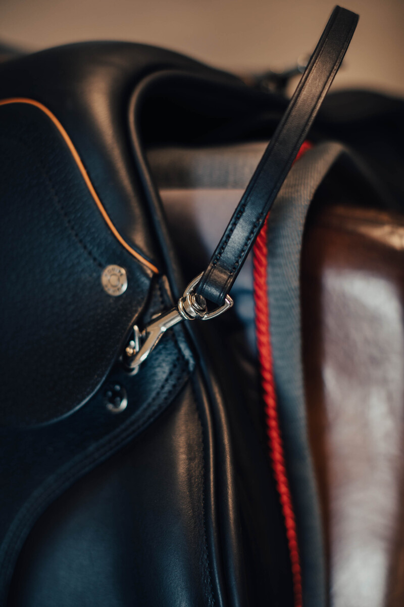 Säkerhetshandtag i läder med spännen för att kunna sättas fast i sadeln.